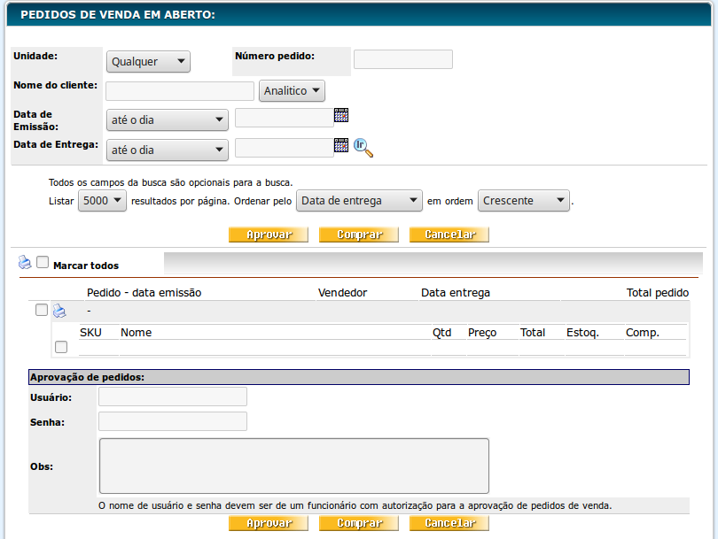 Nesta página ficam aguardando todos os pedidos pendentes de aprovação. Alguns pedidos podem ser automaticamente aprovados dependendo da autorização do usuário. O nome de usuário e senha devem ser de um funcionário com autorização para a aprovação de pedidos de venda e definido na página de autorização do modulo comercial.
