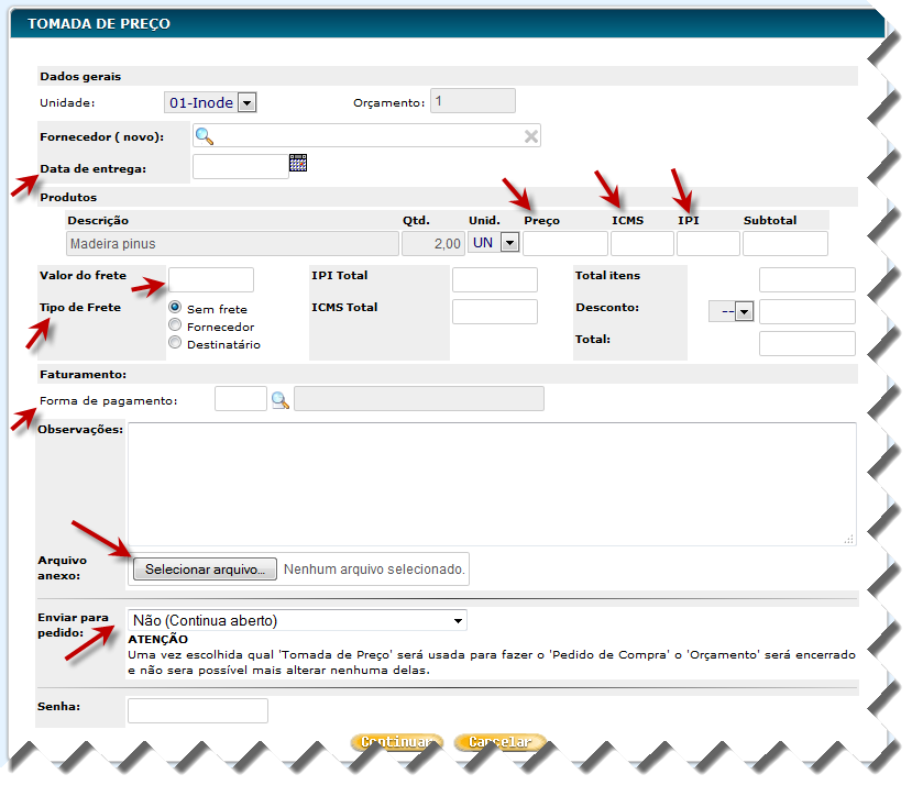 O comprador deverá informar nos campos acima destacados os dados que constam das cotações que ele recebeu dos seus fornecedores.