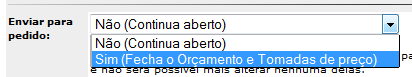 Depois de preencher todas as cotações da Tomada de Preço o comprador deverá escolher qual a que melhor atende as suas necessidades e da empresa. Para isto ele deverá editar a Tomada de Preço desejada e escolher a opção "Sim (Fecha o Orçamento e Tomadas de preço)". O sistema fechará toda as Tomadas de Preços e enviará a escolhida para o Pedido de Compra, que deverá ser aprovado para envio ao Fornecedor.