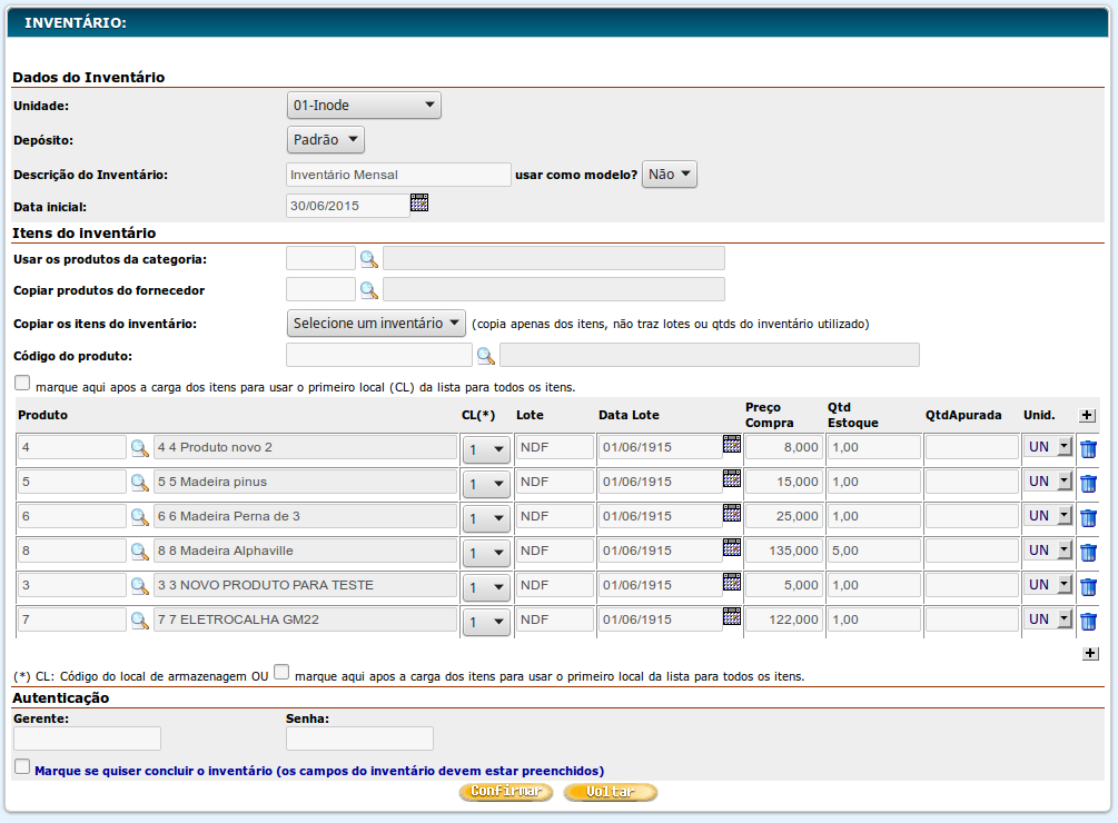 Para fazer um inventário é necessária uma autorização especial para esta finalidade, que é configurada no Menu Autorizações do Módulo.