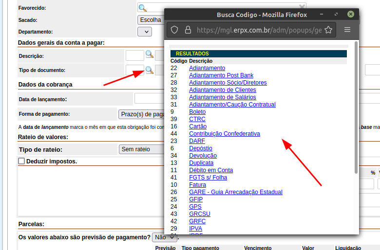Aqui você pode dar um nome ao documento, um código de identificação e escolher a opção débito, crédito ou ambos. Ao serem cadastrados esses documentos podem ser usados nas telas de Contas a Receber e Contas a Pagar como mostra o exemplo abaixo.