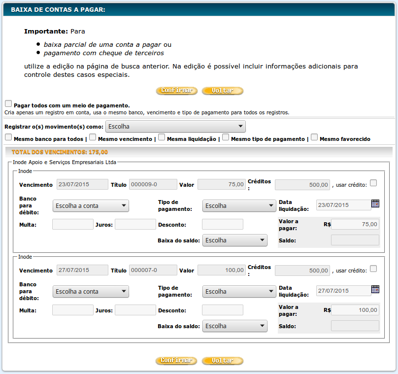 - Mesmo tipo de pagamento: Este checkbox é um facilitador. Se marcado, todos os tipos de pagamento serão iguais ao Tipo de Pagamento escolhido no primeiro título.