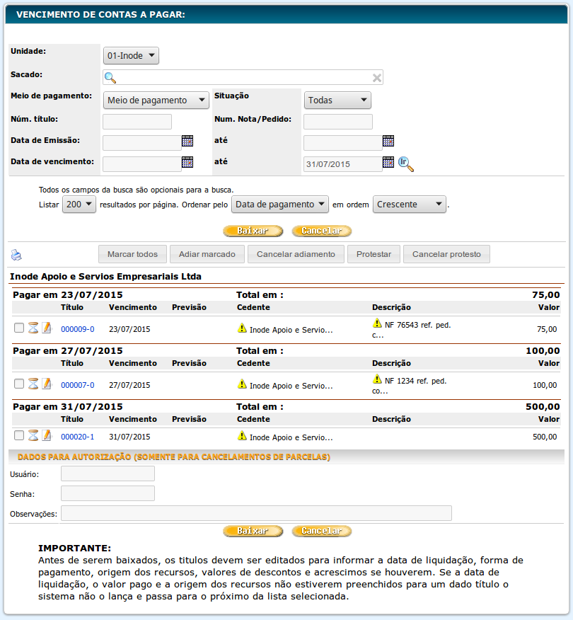 do título desejado. Você pode fazer a baixa de vários pagamentos de uma única vez. - Clique no botão Baixar.