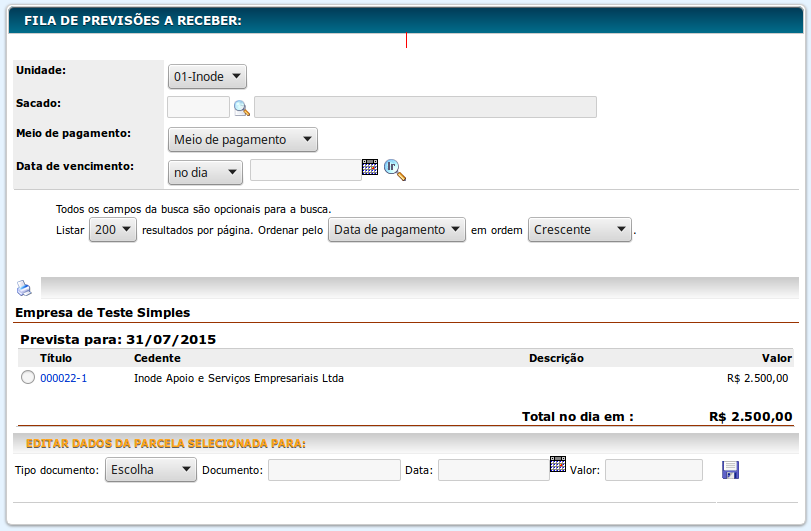 Quando as Previsões de Recebimento são criadas elas aparecem nesta fila de previsões e também em relatórios e no Fluxo de Caixa.