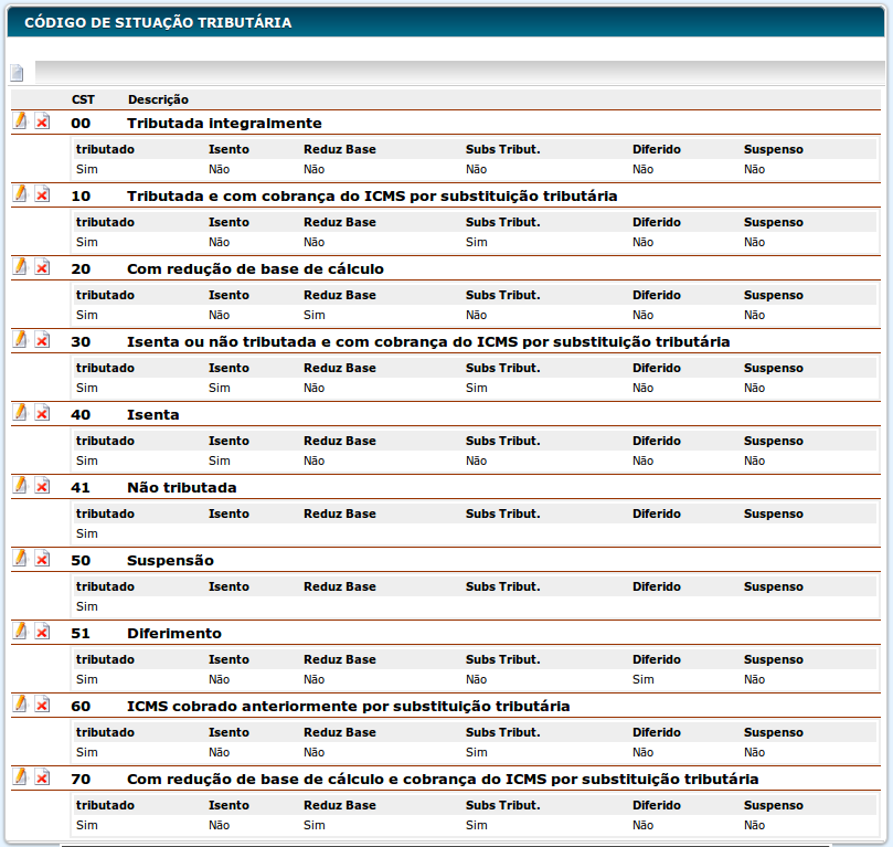 O ERPx já vem configurado com os Código de Situação Tributária - CST utilizados normalmente, portanto, qualquer alteração nestas informações farão que o sistema opere da forma que foi alterado.