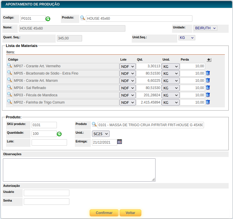 Esta página é utilizada para o Apontamento de Produção.
